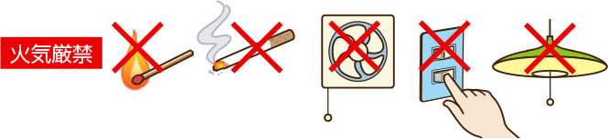 - 火気は絶対に使わず、電気のスイッチにも手を触れないようにしてください。