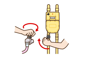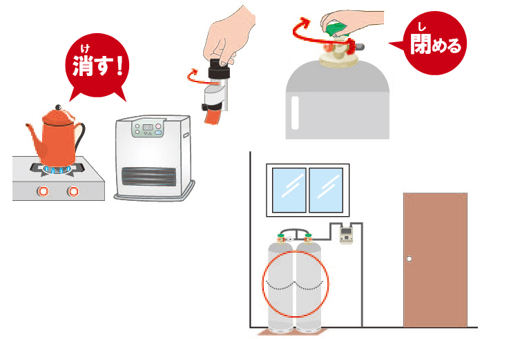 ガス栓やメーターガス栓、ガスボンベのコックを閉めましょう。