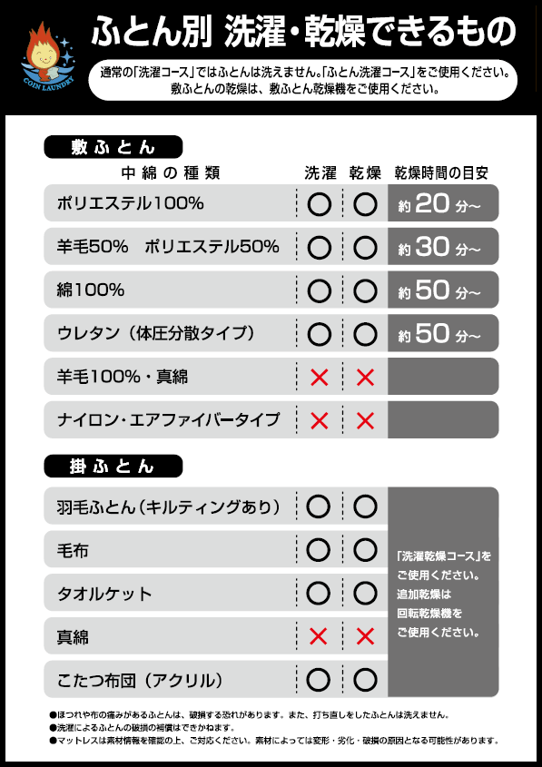 キルティング加工がされているもので、中綿素材がポリエステル100%、羊毛50%・ポリエステル50%、綿100%、ウレタウン(体圧分散タイプ・一部出来ないものあり)は洗えます。羊毛100%、真綿100%、ナイロン、エアファイバータイプはご利用いただけません。キルティング加工がほつれてしまっている場合は、中綿が出てしまう可能性があります。ふとんについている洗濯タグをご確認の上、ご利用ください。