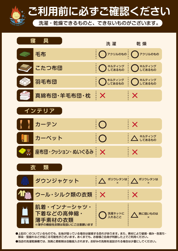 保健所の指導により、ペットの毛が付着した洗濯物の洗濯・乾燥は、他のお客様へご迷惑となりますので、ご遠慮ください。