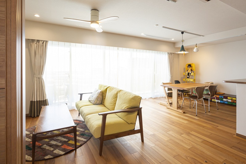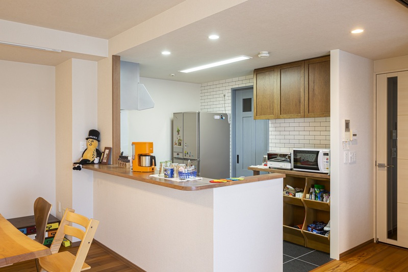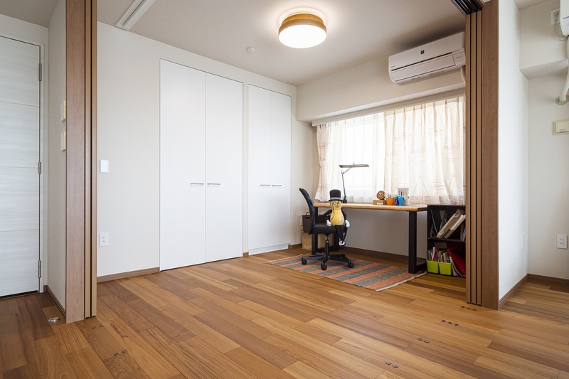 LDK横の洋室との間仕切りを大開口の扉にすることで、LDKをより一層広々と利用出来るようにしました。全部屋の壁紙と床材を変えることでイメージを一新した、こだわりの詰まったリフォームです。