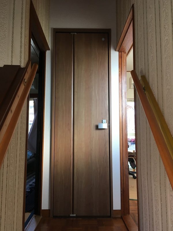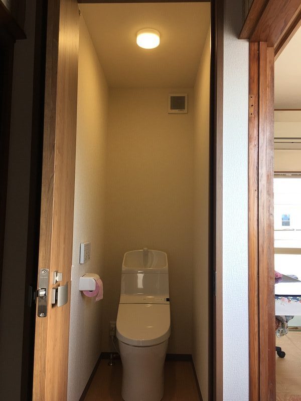 80代ご夫婦のお宅で、普段寝ている2階にトイレが無く大変不便していたので、2階の和室の押し入れを解体し新たにトイレを設置しました。開閉しやすく、広く開口が取れるスライディングドアを取り付け、出入りのしやすさも考慮しました。