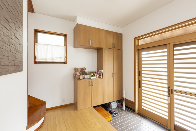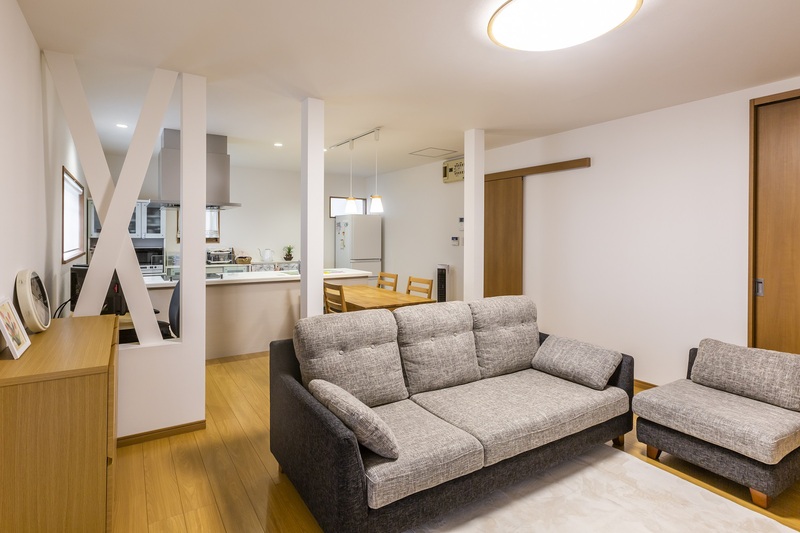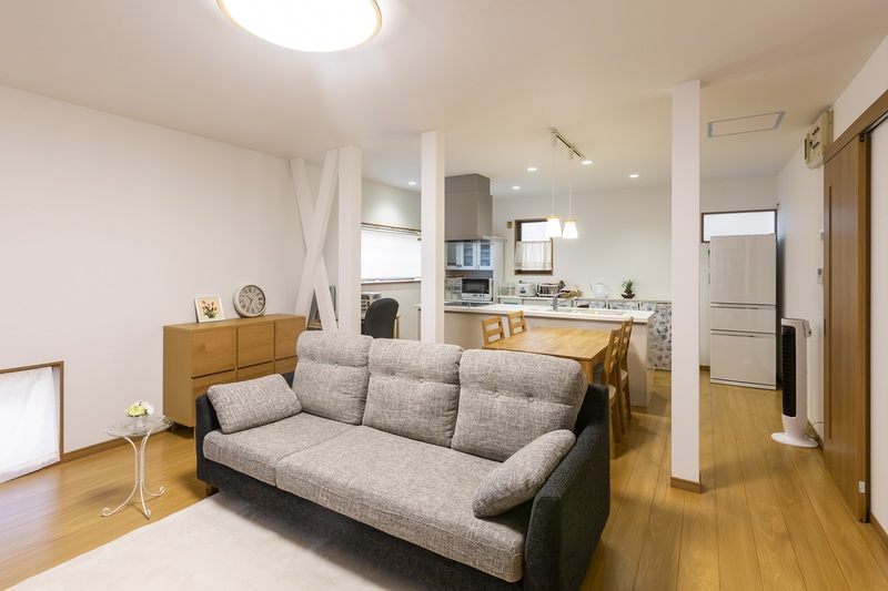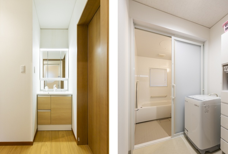 和室とキッチンを一部屋にして、広々LDKへリフォーム。建物の強度を保つため撤去しなかった構造材はアクセントとして現しています。また、浴室の一部を増築しお風呂も広々と。脱衣室も広く使えるよう、あえて洗面化粧台を廊下ホールへ移動したことで、ご家族が入浴中でも洗面化粧台を使って身支度ができるようになりました。
