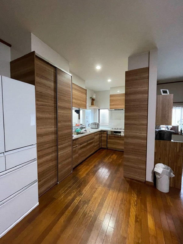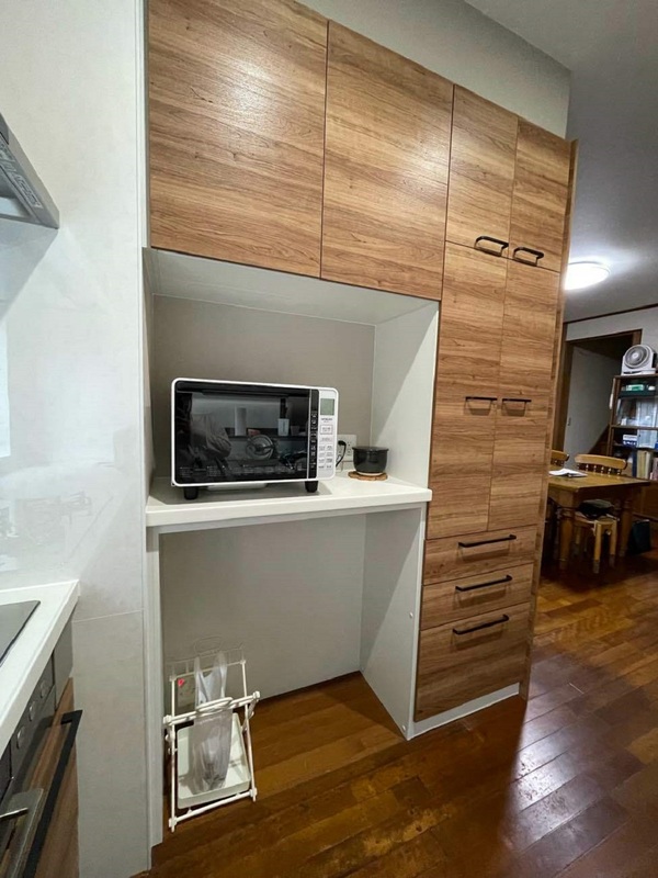 【使い勝手と収納量】をキーワードにリフォームを行いました。吊戸棚は使いやすい昇降タイプを採用。キッチンスペースとダイニングを区切っていた収納棚は撤去して壁を新設し、壁面収納とカウンターを設置しました。隠す収納と見せる収納を使い分けて、お好みの空間づくりができました。