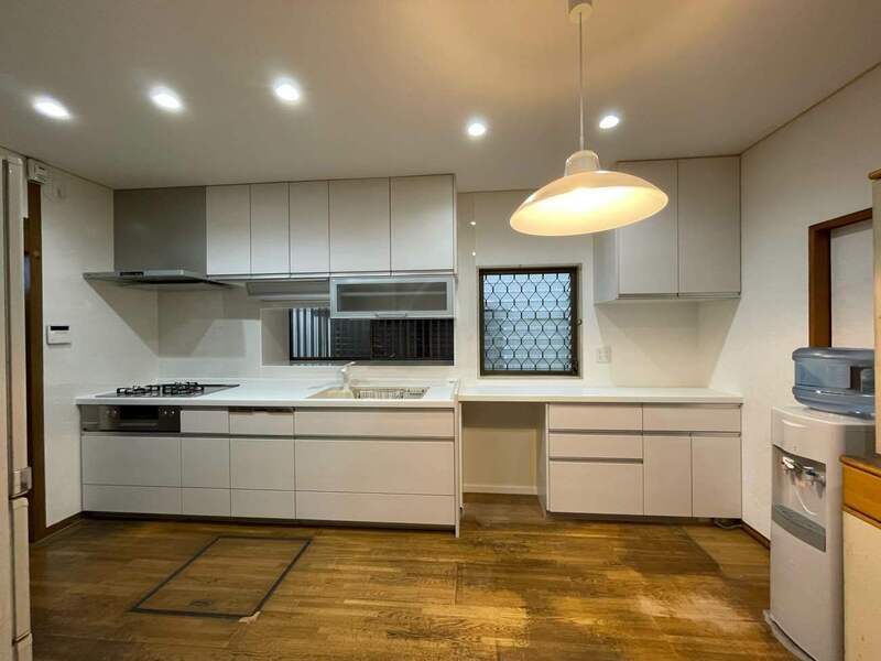 キッチンの収納量にこだわって、壁一面にキッチンとカップボードを配置しました。元々窓が小さく暗かったキッチンですが、LED照明にして、壁紙を張替たことで明るい空間になりました。