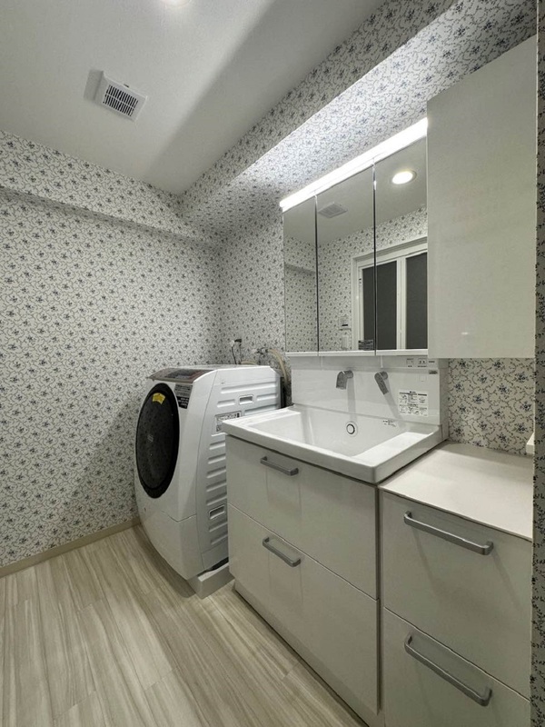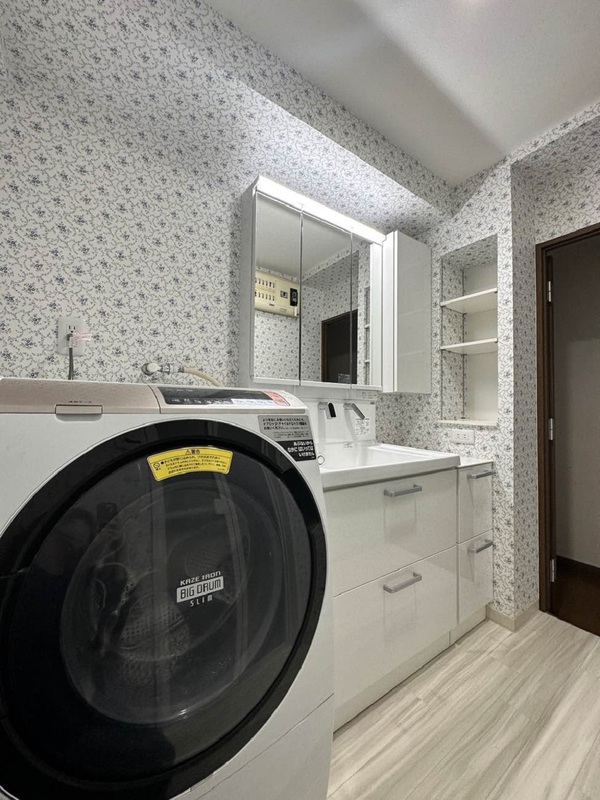 浴室・洗面室の老朽化や収納の少なさが気になっており、リフォームをご検討いただきました。浴室には浴室暖房を採用し暖かく快適なシステムバスを実現。洗面室は奥様お気に入りのクロスで明るい空間に仕上げました。洗面化粧台横の埋込収納は、可動棚にすることで使いやすくなりました。