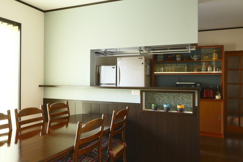 平屋を全面的にリフォームし、生活動線を考えた間取り変更で広々としたLDK空間を実現。ダーク系の床・建具に統一し、アンティーク家具が生える古民家テイストの内装に仕上げました。構造上必要な柱を利用した格子壁や、格子+ガラス入り障子で雰囲気を演出