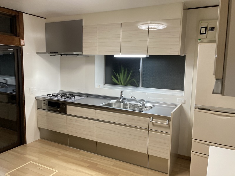 キッチン本体が古くなってきた事や床のたわみが気になってリフォームを検討。床は断熱材を入れて張替えを行い、設備はキッチンとカップボードを交換しました。また、掃き出しの窓を小さくして、新たな勝手口を取り付けました。