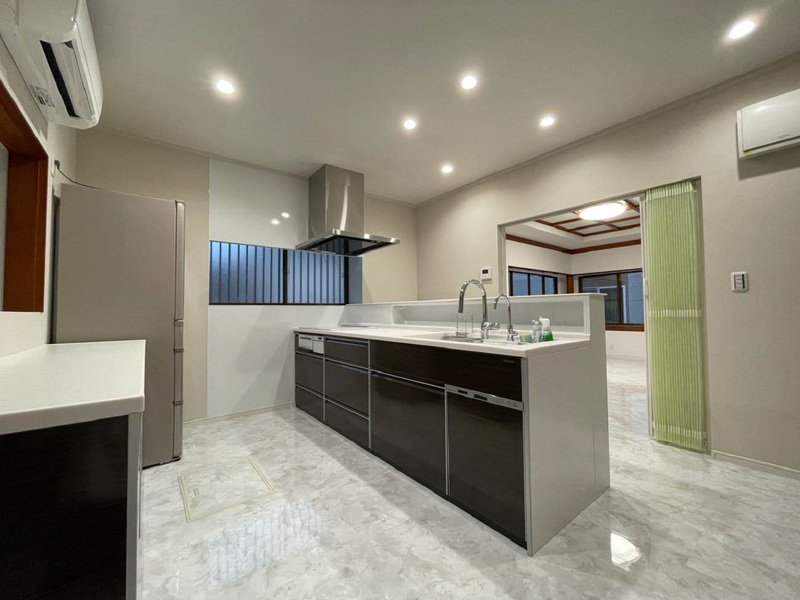 将来を見据えて、主に戸建の1階で快適に過ごせるようにするためのリノベーションを行いました。1階をほぼスケルトンにして断熱材を新しくし、窓ガラスを交換したことで温かい空間になりました。特にこだわったキッチンはコの字型の対面キッチンを採用し、広