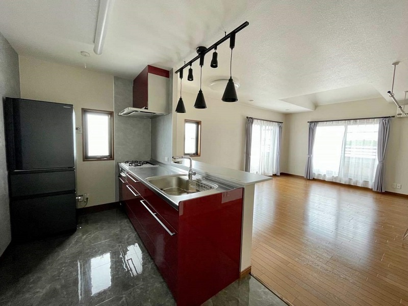 中古物件のリフォームを行いました。キッチン周りの物入を撤去して、キッチンを広々と使えるようにしました。ボルドーカラーの扉をアクセントに周辺はモノトーンでまとめました。リビングから続く和室は洋室にしました。