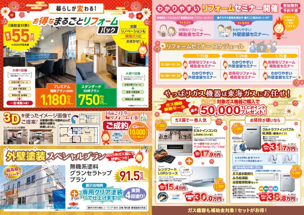 東海ガスのお年玉リフォーム相談会を開催いたします!今年最初のフェアです!リフォームのお得なスペシャルセット・プランでご用意しております🛀その他、大好評のリフォームセミナーや補助金のご相談も行っております。ガス機器の新春セールも実施!この機会にぜひご相談ください😊